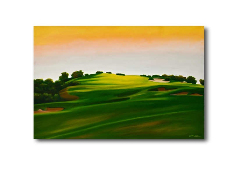 Twilight Golf overlooking the Mediterranean Sea at Aphrodite Hills Resort. The piece captures the beauty of the layout during twilight times. Warm colors and think paint has been applied to capture the reality of the scenery.