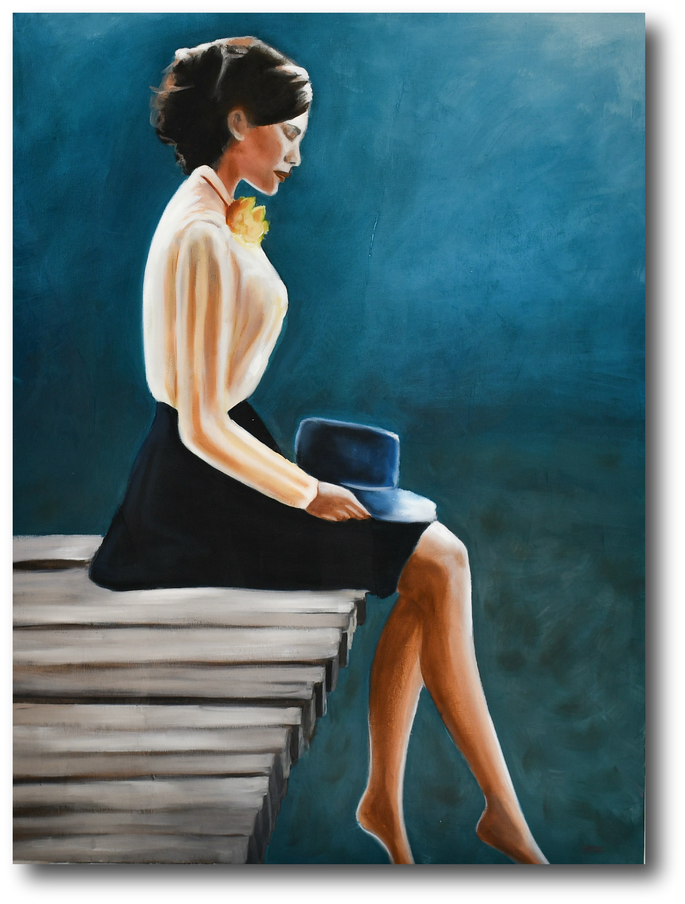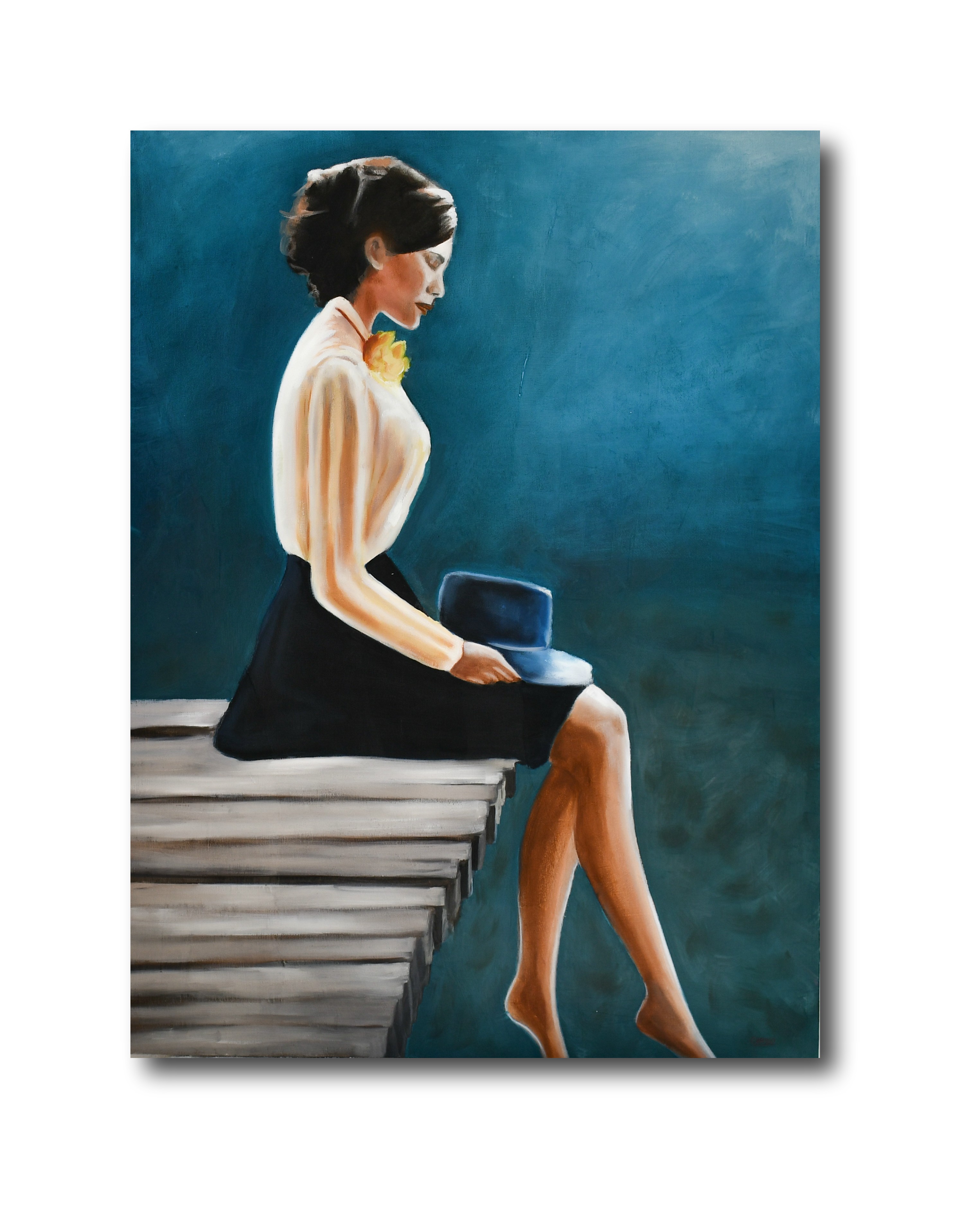 This piece represents the daydreaming of a woman. The painting captures the skeptical side of the lady while gazing in the ocean.