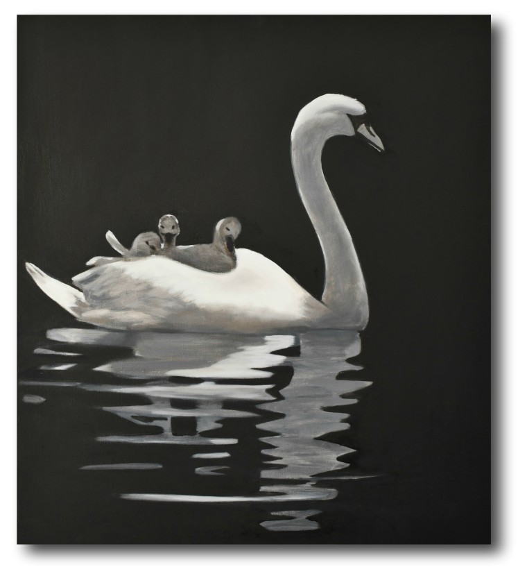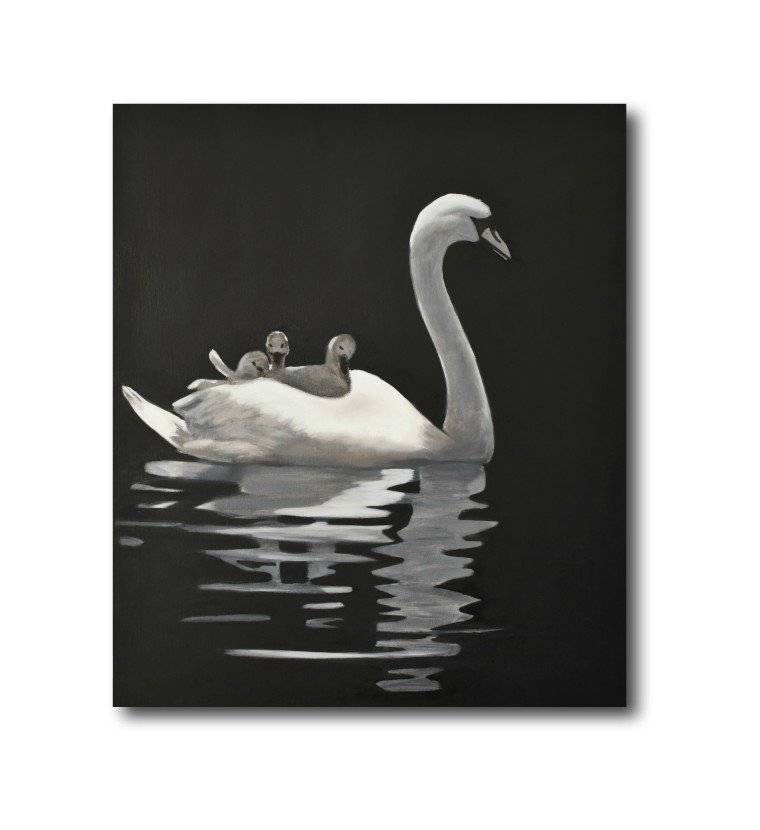 This is the second piece after the original painting ‘Swan’. The family, that represents motherhood. Swans are symbolic of love, devotion and partnership. The painting captures the Swan mother who protects her babies and that she would do anything to keep the alive. It captures the power of the mother.