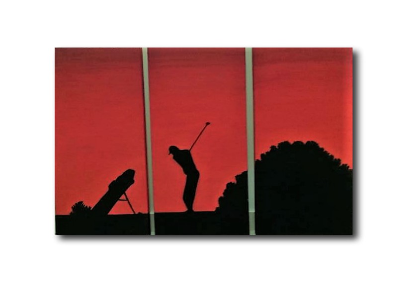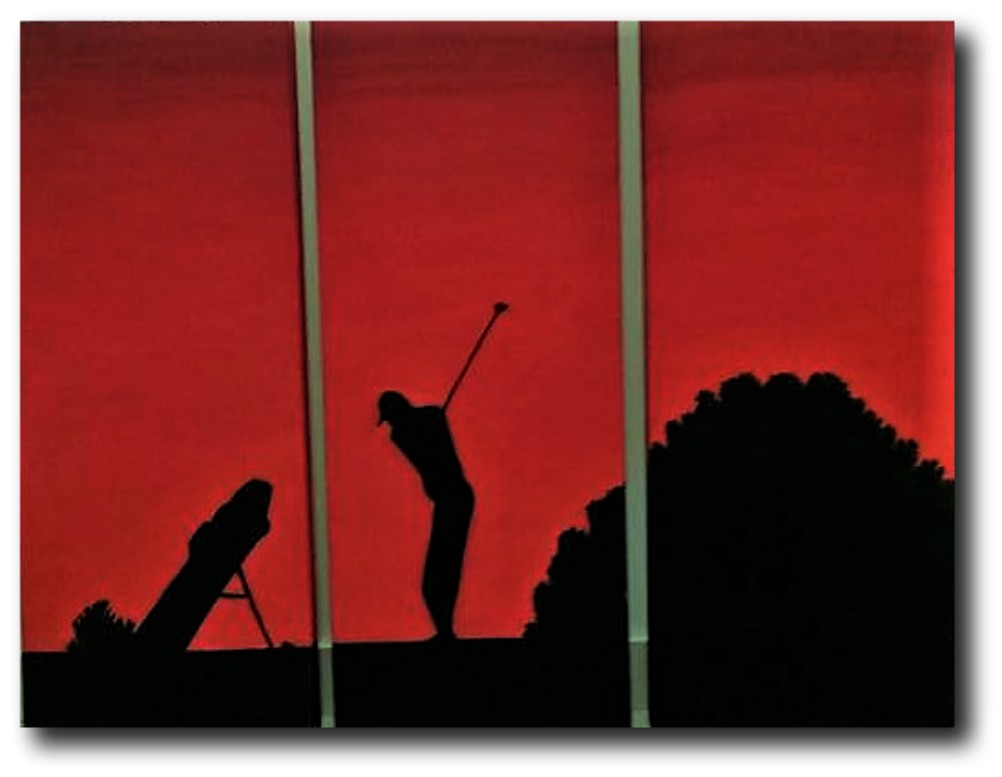 A silhouette painting of a golfer while playing golf during sunset. The beautiful red sky falls over the golf course.