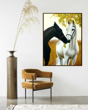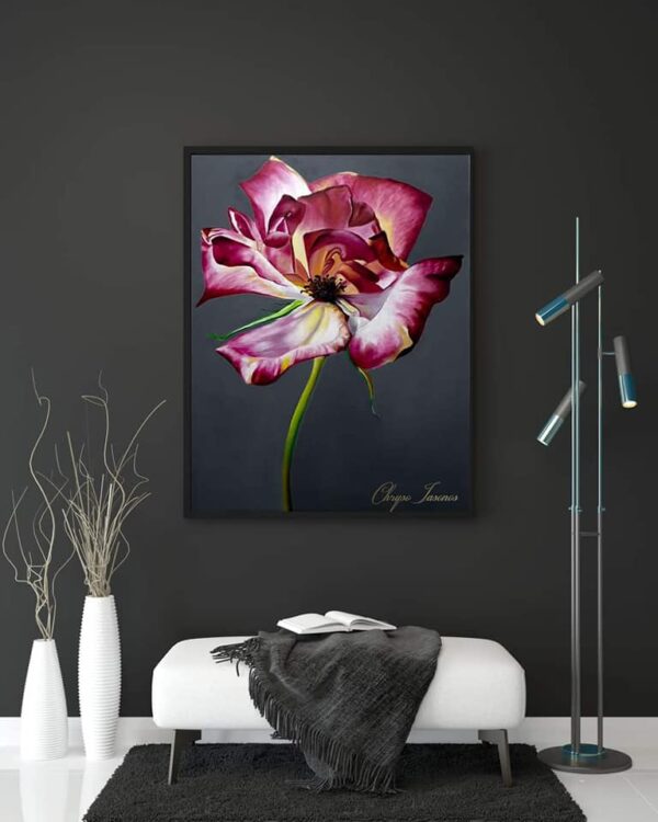 Multiple tools have been applied for the creation of this commission painting including brushes and palette knives, resulting in texture and interest throughout the painting.