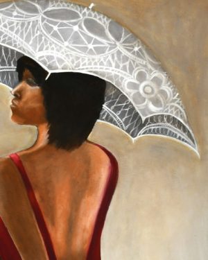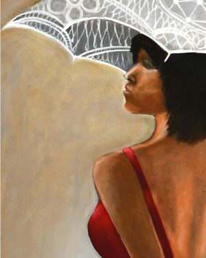Oil painting for the Sous Le Parasol. Multiple tools have been applied for the creation of this painting including brushes and clothes, resulting in texture and interest throughout the painting.