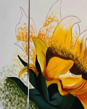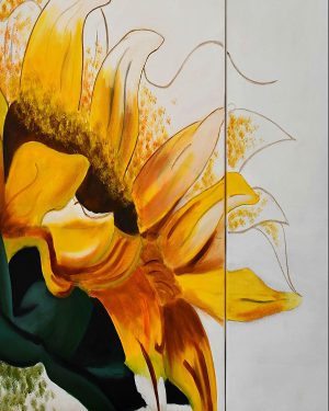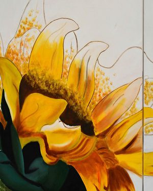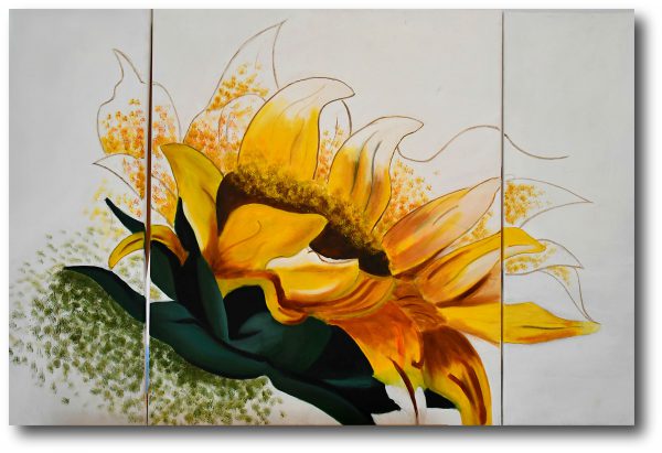 This creation is painted on a 3-piece canvas, capturing the beauty of the sunflower and the electric colors. The open face of the sunflower symbolizes the sun itself, conveying warmth and happiness, adoration and longevity.