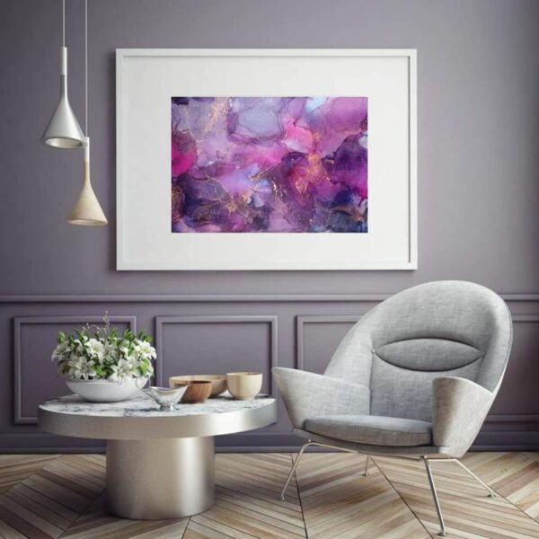 Mixed Media fluids mounted on paper,. The Artwork comes with white frame ready to hang on the wall.